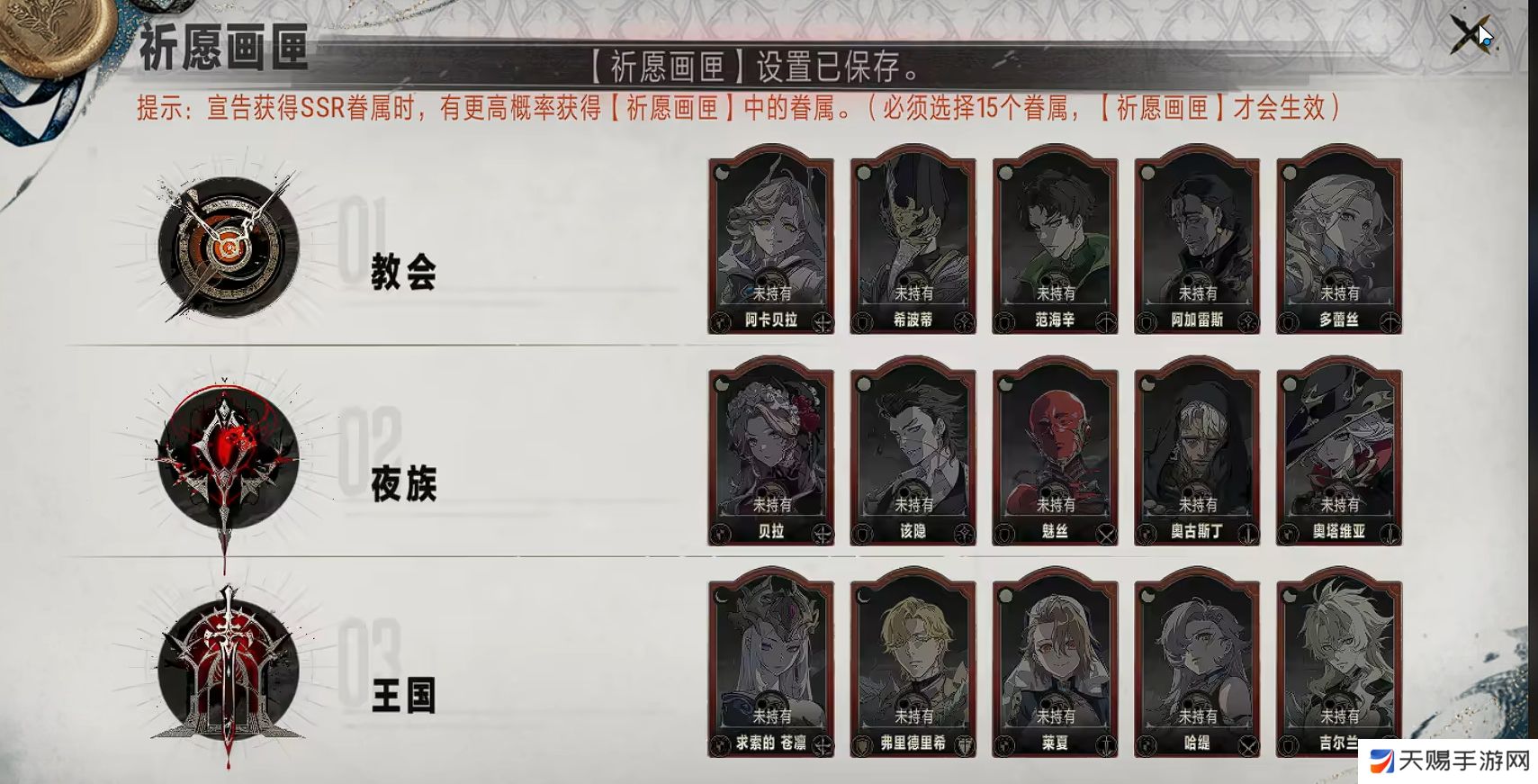 玩家抽取常驻池的次数达到40次时,可开启祈愿画匣功能,并从每个阵营的SSR挑选5名作为心愿单,三个阵营共计15名。往后玩家在抽卡时,有更高的概率能抽取祈愿画匣中所选定的角色,等同于提高玩家所选15名角色的出货概率。