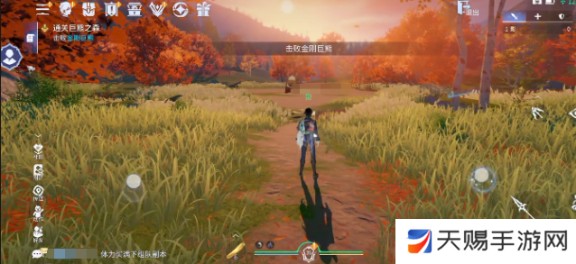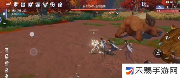 玩家在进入到副本时可以先穿越开阔的草地,需要留意小地图上的任务,要求玩家去击败金刚巨熊。在熟悉场景之后,就可以利用一些位置移动的方法直接跨越地形,提前把一路的小怪全部的清理掉。